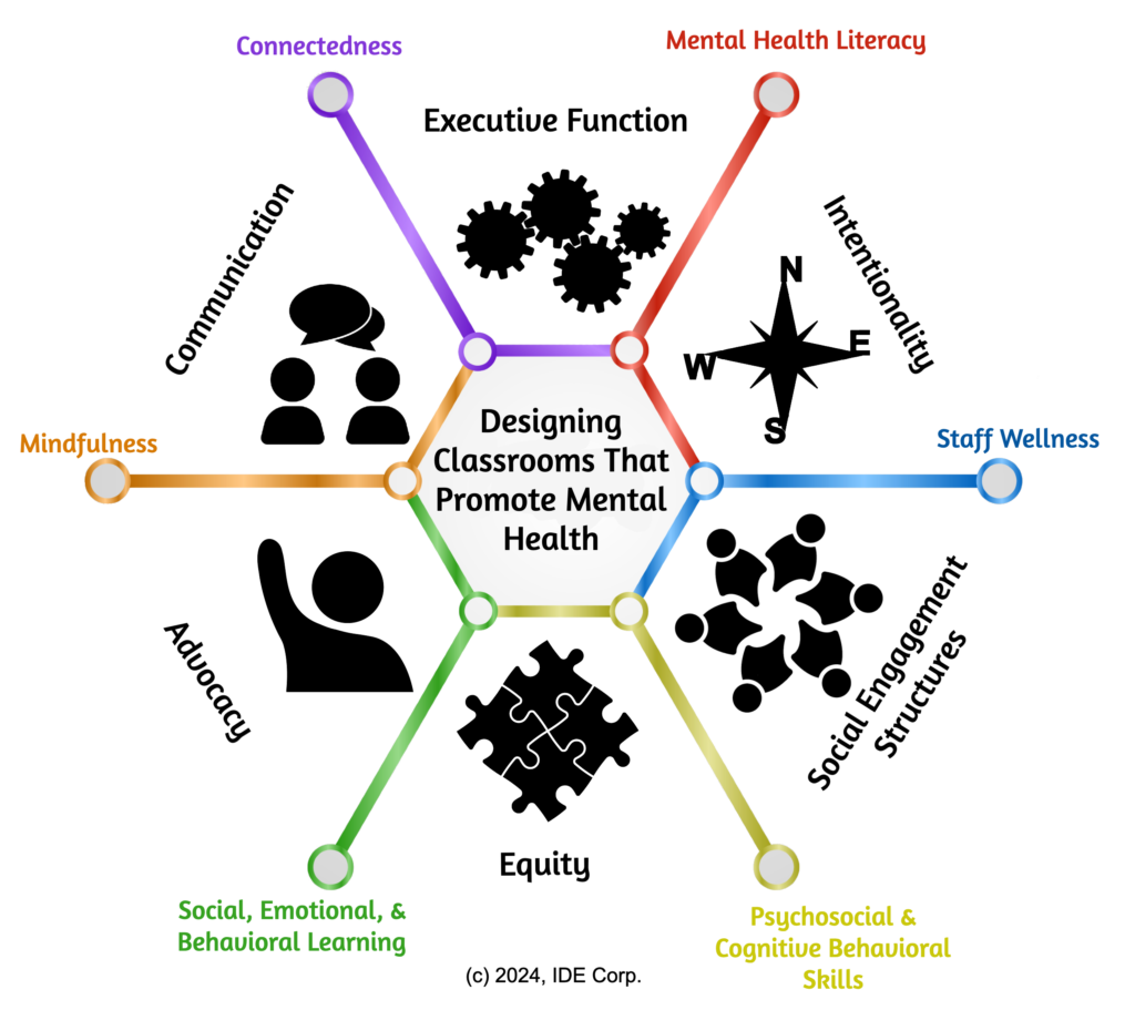 The CDC has identified six key school-based strategies that schools can implement to prevent mental health problems and promote positive behavioral and mental health among students: mental health literacy; connectedness; mindfulness; social, emotional, & behavioral learning; psychosocial & cognitive behavioral skills; and staff wellness. Our sister company, IDE Corp , has developed six strategies to help educators design classrooms that promote mental health: