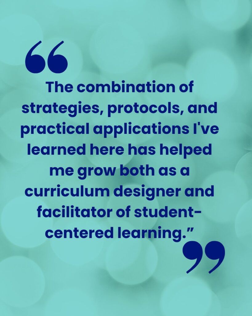 “One of my biggest takeaways has been seeing how authentic anchors and strong PBL task statements can transform engagement. They can shift lessons from stand-alone activities to meaningful, real-world challenges. I’ve also appreciated learning how AI can be used as a thought partner, which has freed up more of my time to focus on the big ideas and long-term planning. The combination of strategies, protocols, and practical applications I’ve learned here has helped me grow both as a curriculum designer and facilitator of student-centered learning.”